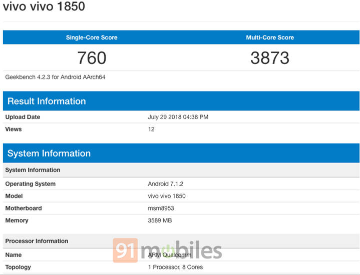 The new Geekbench spotting is seen with a model number ‘Vivo 1850′. The listing reveals that the handset comes powered by MSM8953, which points to the Snapdragon 625 chipset. Further, the smartphone is seen with a 4GB RAM and Android 7.1.2 Nougat pre-installed. The smartphone managed to score 760 points in the single-core test and 3,873 points in the multi-core test. While nothing else is known at this point in time, it is being speculated that the new smartphone could be a slightly toned-down variant of the Vivo V9.