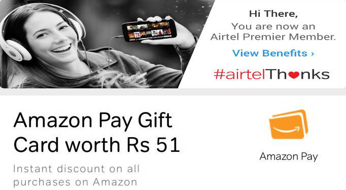 “Airtel is offering a free Amazon Pay gift card worth Rs 51 to its prepaid and postpaid subscribers”