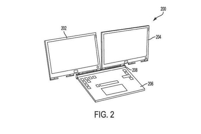 The patent reveals that the laptop’s dual screens can be attached to adjustable clamps of the keyboard by a magnetic strip. Both the screens can either face the users or just one, while the other could face outwards for others to view content such as presentations. The arrangement will allow users to extend content or mirror it to the secondary display.