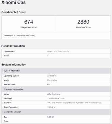Back in June, Xiaomishka reported that a new Xiaomi device with the codename ‘Xiaomi Cas’ will launch with a powerful camera setup that will include a 108MP primary sensor and 120x digital zoom support. The report added that the regular Mi CC10 will come with the Snapdragon 775G chipset. So its possible that the model that has appeared on Geekbench today is the Mi CC10 Pro.