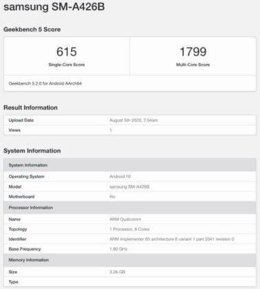 Samsung Galaxy A42 is in the active development and will reportedly be an affordable 5G phone in 2021. Now, the handset has appeared on the Geekbench benchmarking platform and Safety Korea certification site, revealing key specifications. The Galaxy A42 was able to score 615 points in the single-core and 1,799 in the multi-core tests, respectively, on Geekbench, which suggest a mid-range chipset will power the device. The listing shows it will be powered by a Snapdragon processor paired with 4GB RAM and Android 10 OS.