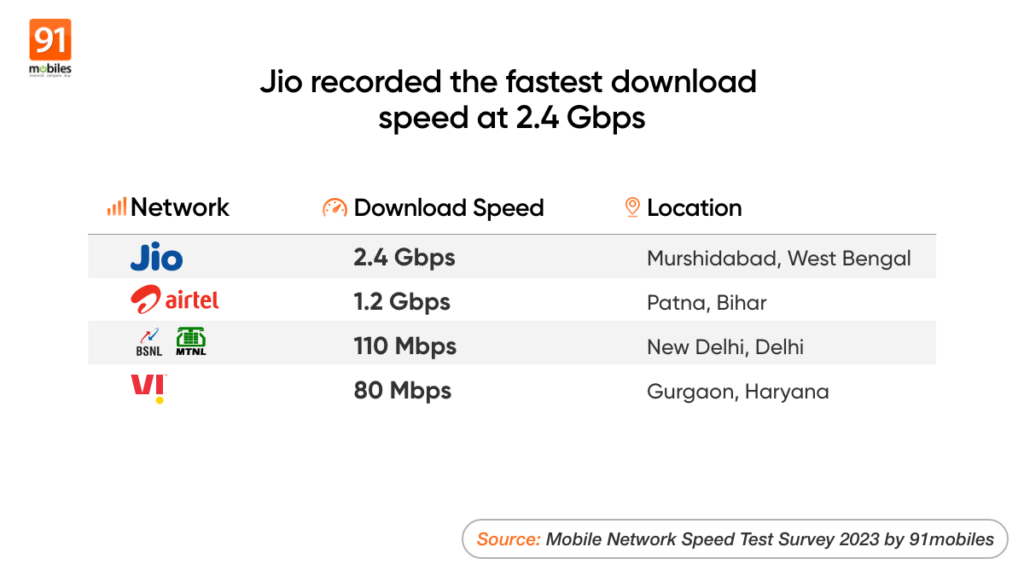 Reliance Jio recorded the fastest mobile network download speed in our survey, with the fastest survey speed recorded at 2.4Gbps. Bharti Airtel ranked second at 1.2Gbps, marking the two telcos that recorded download speeds at above 1.2Gbps.