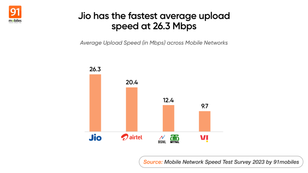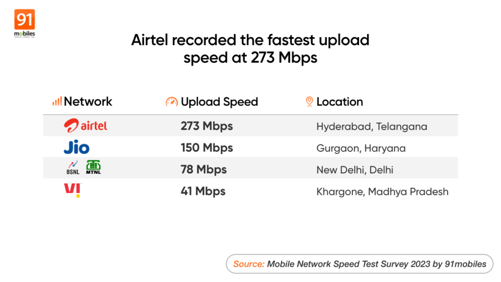 Bharti Airtel outpaced Reliance Jio for the fastest recorded upload speed in the mobile network survey — with its upload speed recorded at a peak of 273Mbps. Reliance Jio ranked second at 150Mbps, with both 4G and 5G networks taken into account together. Among the other two, BSNL/MTNL registered the fastest upload speed of 78Mbps, while Vi registered 41Mbps as its peak upload speed.