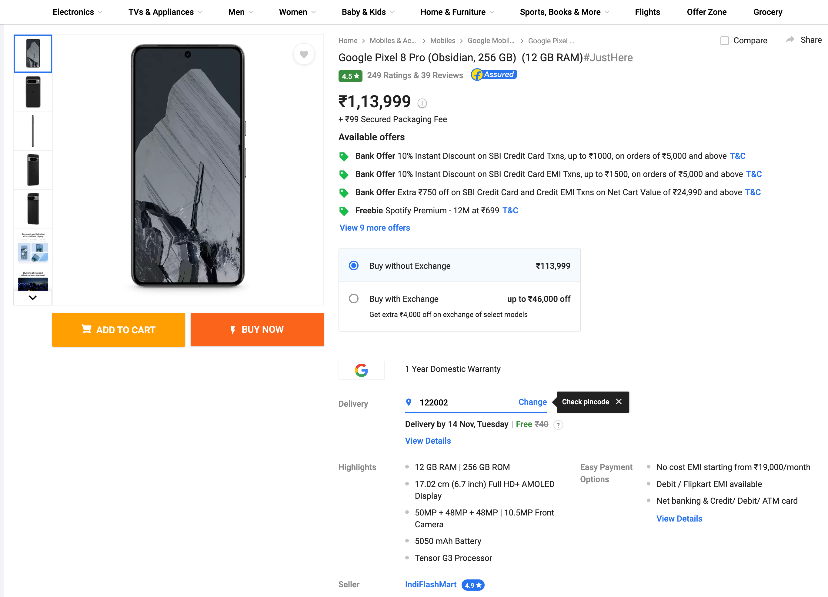 Google Pixel 8 Pro has now been listed on Flipkart with a 256GB variant option. It costs Rs 1,13,999 in the country. A slight caveat is that this variant is only available in a single Obsidian colour option. To recall, the 128GB model of the device launched at Rs. 1,06,999 with Obsidian and Bay colour options.