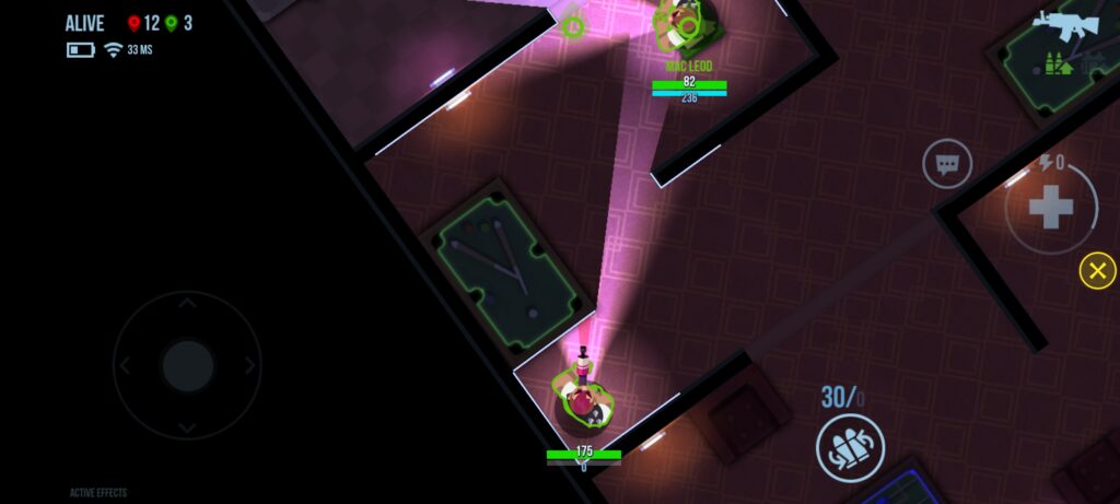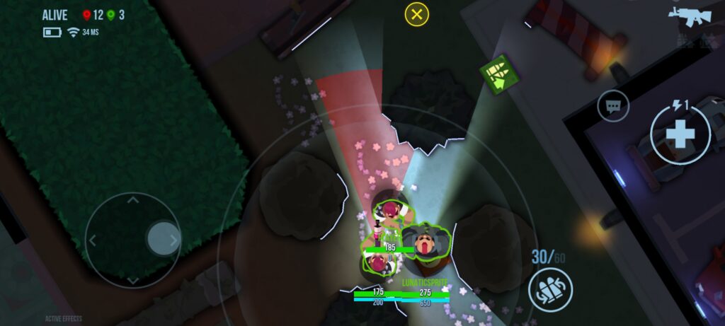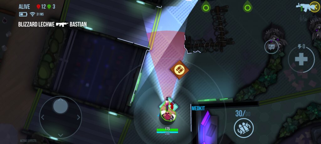 The gameplay of Bullet Echo India is what makes it so unique. The game is a twin-stick PvP shooter that is presented from a top-down angle. The left joystick controls the player’s movements, while the right joystick rotates the character around. There is no specific button to shoot as the game will automatically attack enemies. I would have preferred having a dedicated shoot button, to be honest, but from a top-down perspective, the controls make sense. Aside from this, there are also contextual buttons that pop up based on situations.