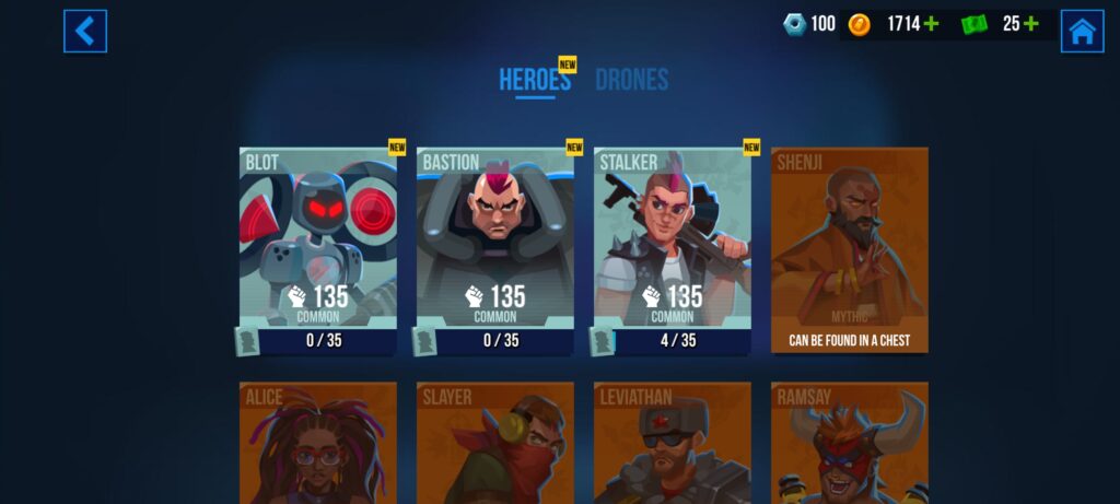 Like most Battle Royale matches, players will need to scramble to pick up items like ammo, armour, health and more. It should be noted that players do not get to pick up weapons. Rather, each character/hero has their own unique weapon that they carry into battle. There are about 27 new Heroes in the game and players can unlock them through in-game currency, randomised chests, or by levelling up. Having multiple heroes to choose from makes things interesting, but the fact the weapons are then locked behind these Heroes isn’t that great in my opinion. This means that players will have to grind out new Heroes or pay money to acquire them. Aside from Heroes, players can also unlock drones that can not only help attack enemies but can also revive the player.