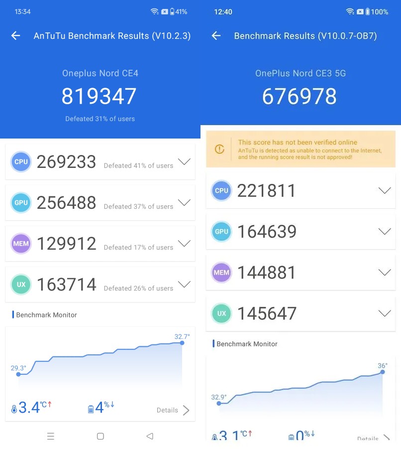The OnePlus Nord CE4 got an overall score of 8,19,347 on AnTuTu, which is roughly 22 percent more than its predecessor. This means that the smartphone will offer better GPU and CPU performance compared to the OnePlus Nord CE3. That said, as indicated by the MEM score, the OnePlus Nord CE3 seems to possess faster memory than the latest Nord smartphone.
