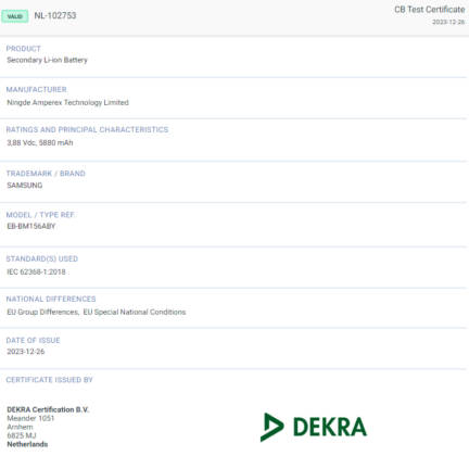 According to the Dekra certification, the Galaxy M35 5G will feature a 5880mAh battery with the model number EB-BM156ABY. This would most likely be marketed as a 6000mAh battery for the Galaxy M35 5G.