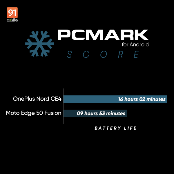 The larger 5,500mAh battery on the OnePlus Nord CE4 helps it score 16 hours 2 minutes on the PCMark battery test. The Motorola Edge 50 Fusion, on the other hand, could only achieve 9 hours 53 minutes. The test was run on both smartphones with 80 percent brightness and 50 percent volume levels.