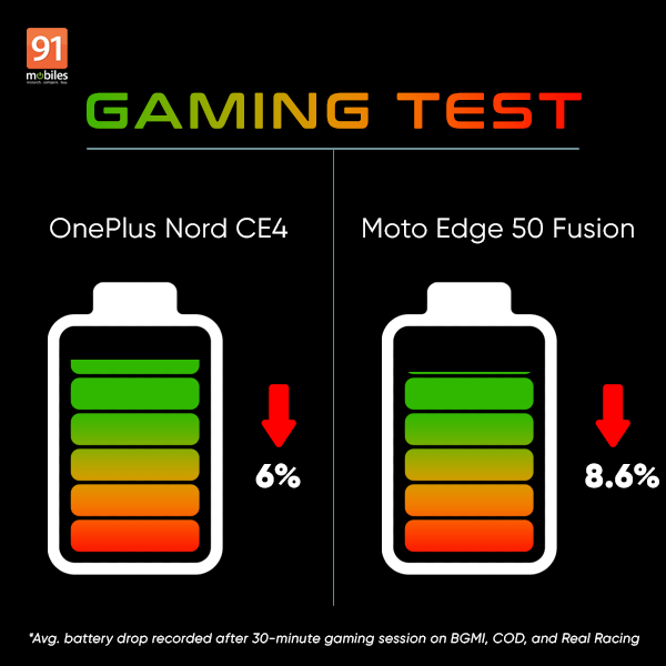 The video playback test involved both devices streaming a 30-minute video on YouTube with FHD resolution and 50 percent brightness and volume levels. After the test, the OnePlus Nord CE4 saw a drop of 3 percent in its battery life, which translates to 165mAh in absolute numbers. Conversely, the Motorola Edge 50 Fusion consumed 4 percent battery, amounting to 200mAh out of its 5,000mAh capacity.