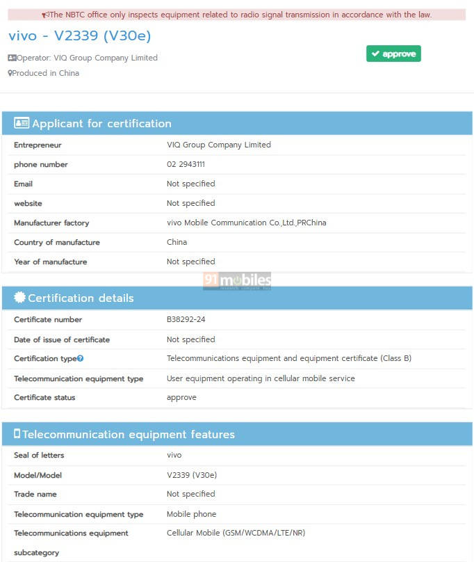 The post Vivo V30e 5G spotted on NCC and NBTC certification sites ahead of May 2nd launch in India first appeared on 91mobiles.com.