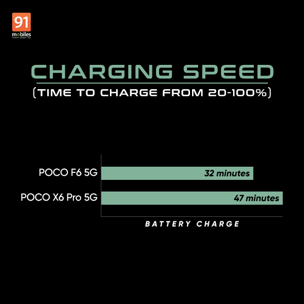 The POCO F6 offers up to 90W fast charging support compared to the 67W fast charging support on the POCO X6 Pro. The former also features a charging boost feature, using which it takes only 32 minutes to recharge the POCO F6 from 20 to 100 percent battery capacity. The POCO X6 Pro, in comparison, takes 47 minutes to achieve the same. The POCO F6 offers better charging speed and wins the test.