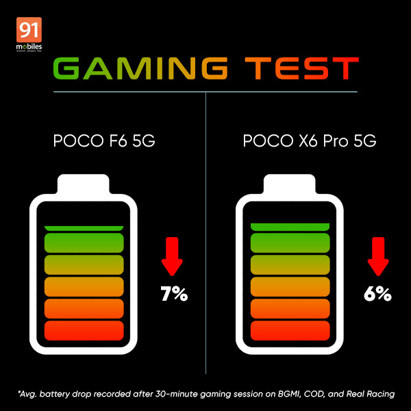 For the gaming test, we played COD: Mobile, Real Racing 3 and BGMI on both phones for 30 minutes each at similar graphical settings to measure their battery drain. At the end of the gaming session, the POCO F6 registered a total battery drain of 22 percent (7 percent average), while the POCO X6 Pro registered a battery drain of 19 percent (6 percent average). The POCO X6 Pro wins the gaming test.