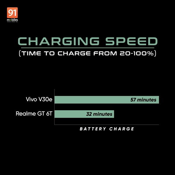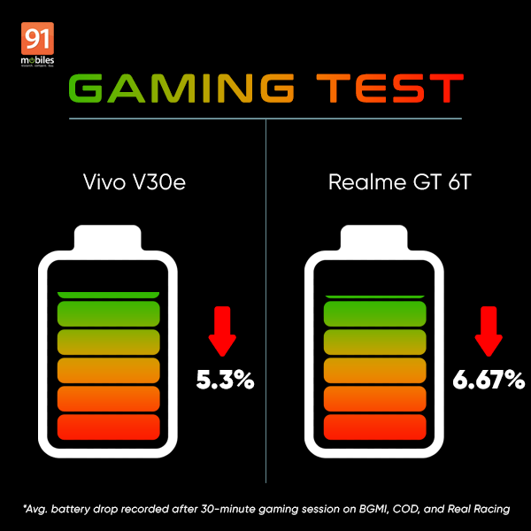 In our gaming test, we played BGMI, Call of Duty, and Real Racing 3 on the handset for half an hour to check how much battery had been drained during our gameplay. In this test, the Realme GT 6T dropped an average of 6.67 percent battery while the Vivo V30e lost an average of 5.3 percent battery. Clearly, the V30e managed to handle our gaming sessions better.