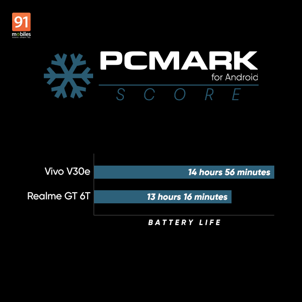 The Realme GT 6T, with its 5,500mAh battery, managed to last 13 hours and 16 minutes on the PC Mark battery test. However, the Vivo V30e, with the same battery capacity, lasted 14 hours and 56 minutes, which is considerably longer than the battery life offered by the GT 6T.